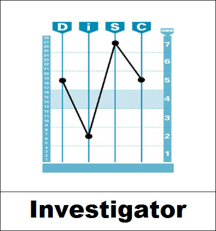 People with the the DiSC® Classic Profile Investigator pattern have dogged determination to goals and follow-through.  Investigators are clear about the results they want.   They calmly and steadily pursue toward a fixed goal.  With a clear plan and organized actions they accomplish much.  They thrive on challenging technical assignments where they can use logic instead of emotion.  Their determination and tenacity sometimes needs re-directing. Investigators value accomplishing things in a well done fashion.  They assume heavy responsibility and are attentive to important details.   They have a keen ability to learn from experience, and can take corrective action when needed.
