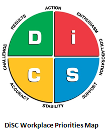 The DiSC® Workplace Priorities Map shows us that the Dominant Styles prioritize RESULTS – CHALLENGE and ACTION.