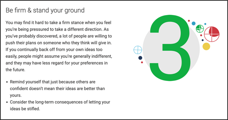 In this part, Mateo saw that the Catalyst engine had developed the top three things he could do to thrive at work. Based on his priorities, and on his motivators and stressors, the strategies were personal and actionable. They included specific tasks Mateo could do, each strategy designed to improve his workplace relationships. For example, Mateo wanted to learn how to stand his ground, and his third strategy included these tips: